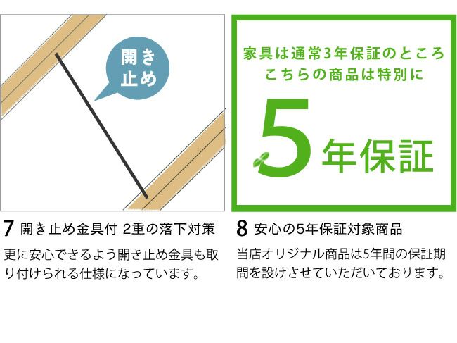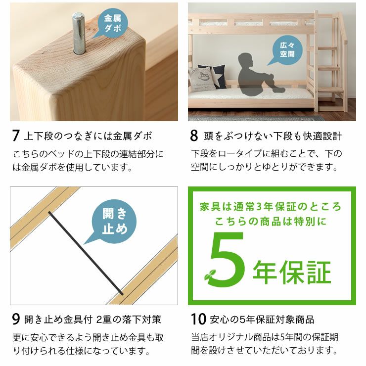 A3:二段ベッドの安全性で重要なのは、耐震性・転落防止・素材の安全性の3点です。耐震性は接合部がネジでしっかり固定され、揺れに強い構造であることが必須。転落防止には高さ30cm以上のサイドフレームが効果的です。素材はF☆☆☆☆(フォースター)の低ホルムアルデヒド仕様や、天然由来の水性塗料・蜜蝋仕上げなど、お子さまに安全なものを選びましょう。当店の国産二段ベッドは耐震金具プレゼント付きで、国産ひのき無垢材使用、JIS規格クリアの高品質。メーカー5~6年保証もあり安心です。