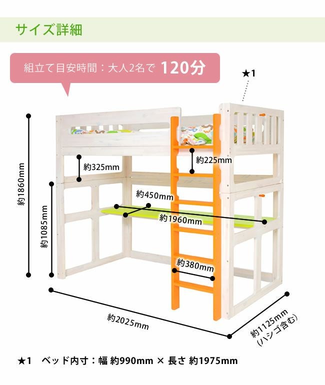 | サイズ | 外寸:幅1125×長2025×高1860(mm) 内寸:幅990×長1975(mm) シングル時外寸:幅1045×長2025×高775(mm) ハシゴ:幅430×長1460(mm) 下収納スペース高:325(mm) |