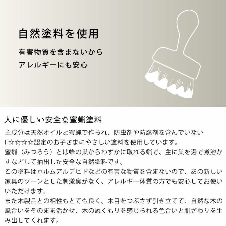 主成分は天然オイルと蜜蝋で作られ、防虫剤や防腐剤を含んでいないF☆☆☆☆認定のお子さまにやさしい塗料を使用しています。