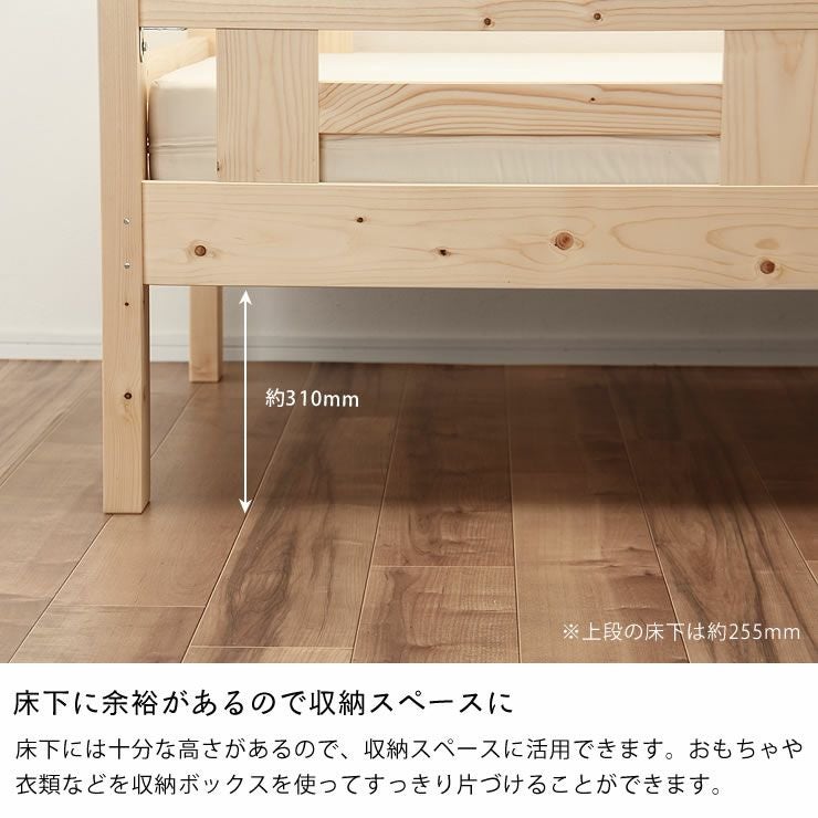 寝相の悪いお子さまでも、高めの柵がついているので、落下防止してくれます。※下段は片面のみ柵付き
