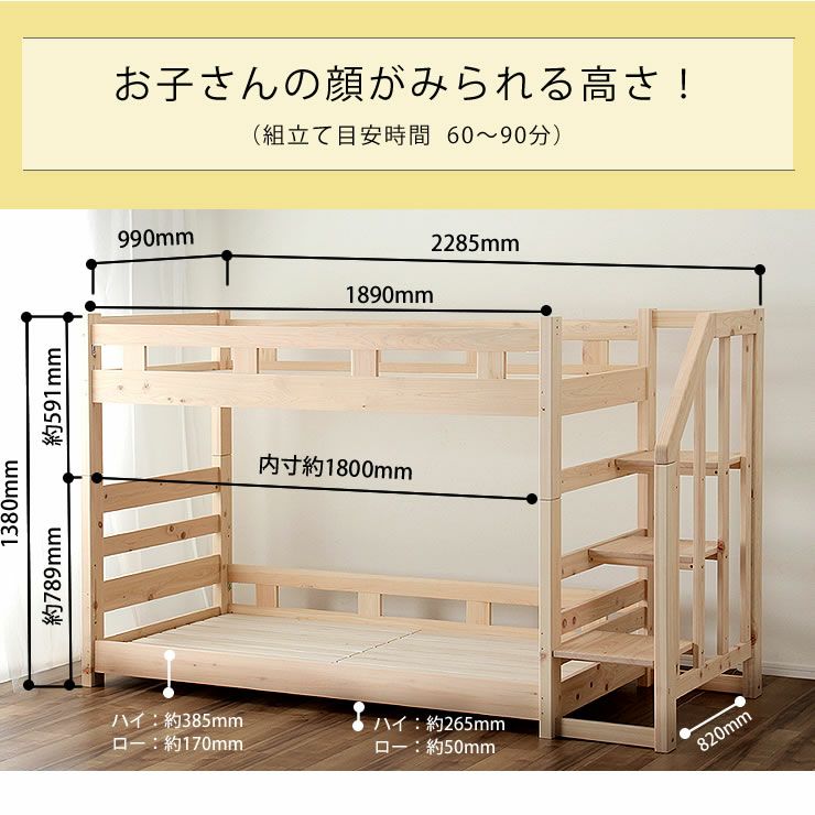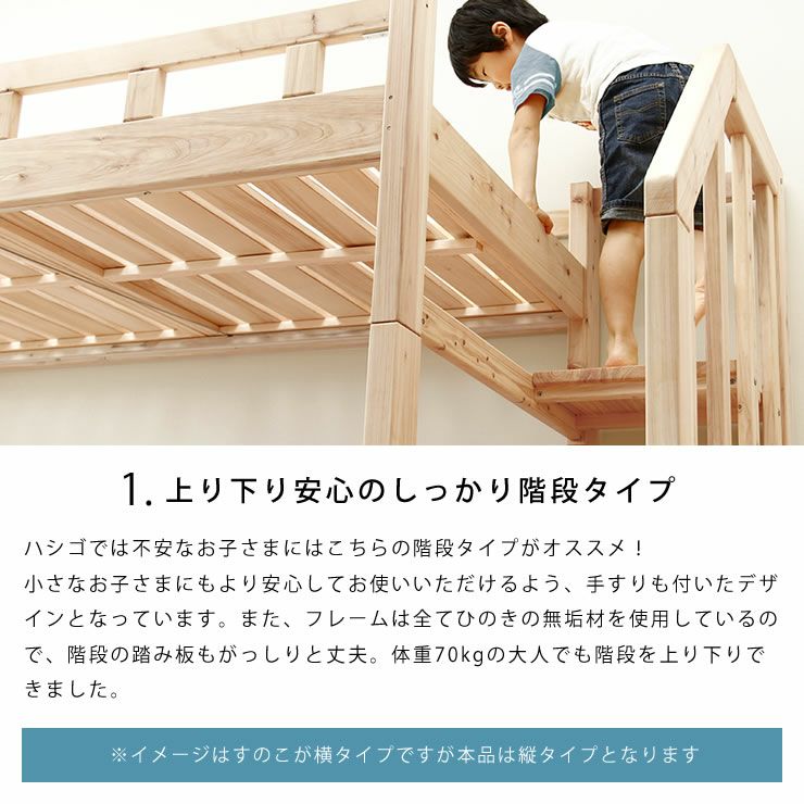 手すりと階段がついて、更に下段の空間高をしっかりと確保できる二段ベッド。しかも二段目のお子さんの寝顔が見れる高さ設計♪フレームには100%国産ひのきを使用しています。また有害な物質を含まない安心の塗料で仕上げたアレルギー対策バツグンの職人が作る二段ベッドです。