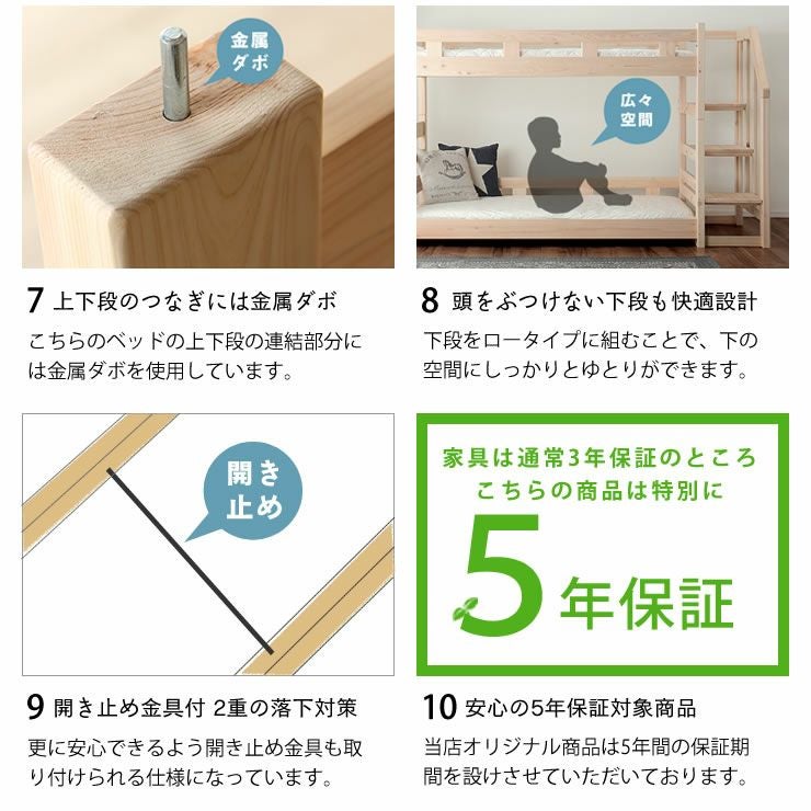 | その他 | ・生産国 日本製(福岡県) ・F☆☆☆☆相当製品 ・塗料 F☆☆☆☆ ・接着剤 F☆☆☆☆相当 ・ハシゴ 階段式(左右組替可能) ・個口数 5個口 ・1段での使用 可能 ・下段のみ2段階高さ調節 可能 ・2台並べた際の床面高段差 あり ・サイドフレームの柵は脱着 不可 ・必要工具 プラスドライバー(六角スパナは付属) ・通気性の良いすのこ式 ・耐荷重 二段ベッド使用時 各段約180kg シングルベッド使用時 約180kg ・こちらの商品は【組立品】です 【熨斗不可】 |