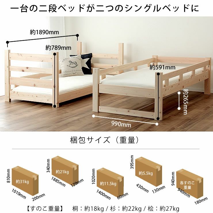 | その他 | ・生産国 日本製(福岡県) ・F☆☆☆☆相当製品 ・塗料 F☆☆☆☆ ・接着剤 F☆☆☆☆相当 ・ハシゴ 階段式(左右組替可能) ・個口数 5個口 ・1段での使用 可能 ・下段のみ2段階高さ調節 可能 ・2台並べた際の床面高段差 あり ・サイドフレームの柵は脱着 不可 ・必要工具 プラスドライバー(六角スパナは付属) ・通気性の良いすのこ式 ・耐荷重 二段ベッド使用時 各段約180kg シングルベッド使用時 約180kg ・こちらの商品は【組立品】です 【熨斗不可】 |