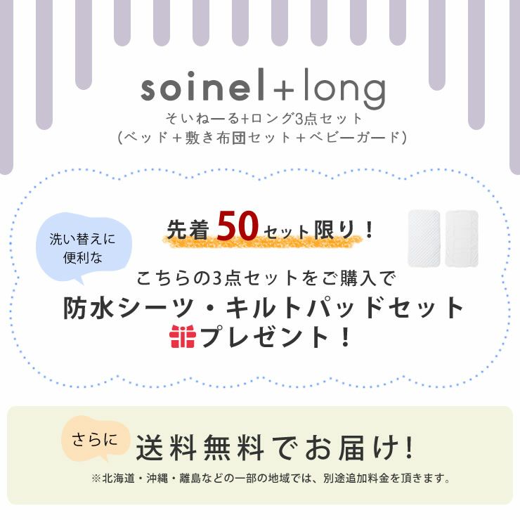 大人のベッドにつなげることで安全に添い寝ができる延長式のベビーベッド「そいねーる」。人気のベビーベッドと掛け布団、ベビーガードの3点セットをご購入いただいた方には、そいねーる専用サイズの「防水シーツ」と「キルトパッド」をプレゼントしております!