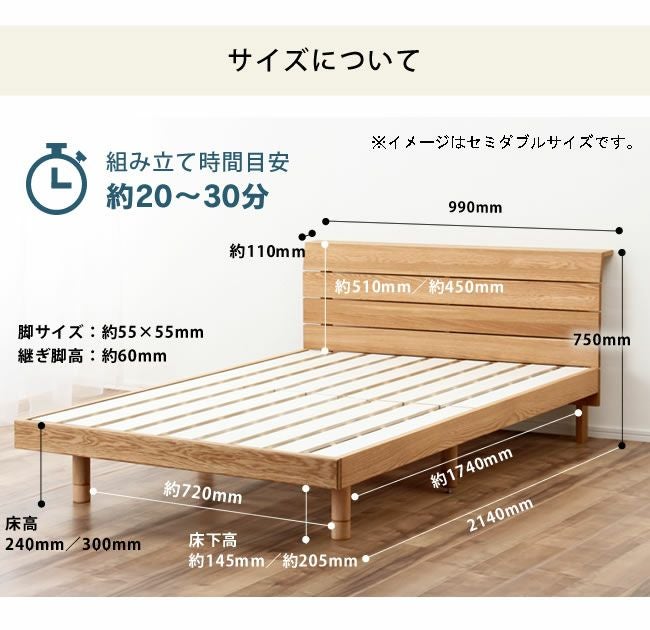 木目の美しいオーク無垢材を使用したシンプルなデザインの棚付き国産すのこベッド。継ぎ脚付きなので床の高さを2段階調整可能です。