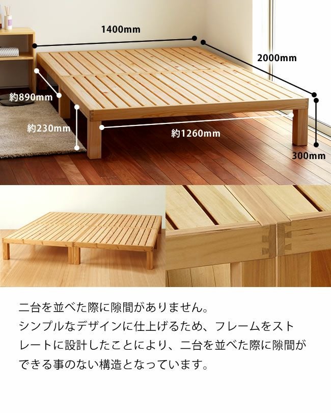 | サイズ | ■ベッドフレーム 幅1400×長2000×高300(mm) スノコ厚:15(mm) スノコ幅:70(mm) ■マットレス 幅1400×長1950×高170 (mm) |