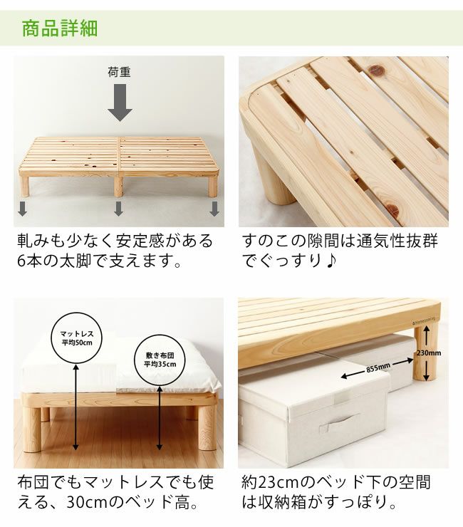| 材質 | ■ベッドフレーム・すのこ 国産ひのき無垢材・集成材 ■マットレス 詰物:二重キルト、ウレタンフォーム 生地:ポリエステル100% |