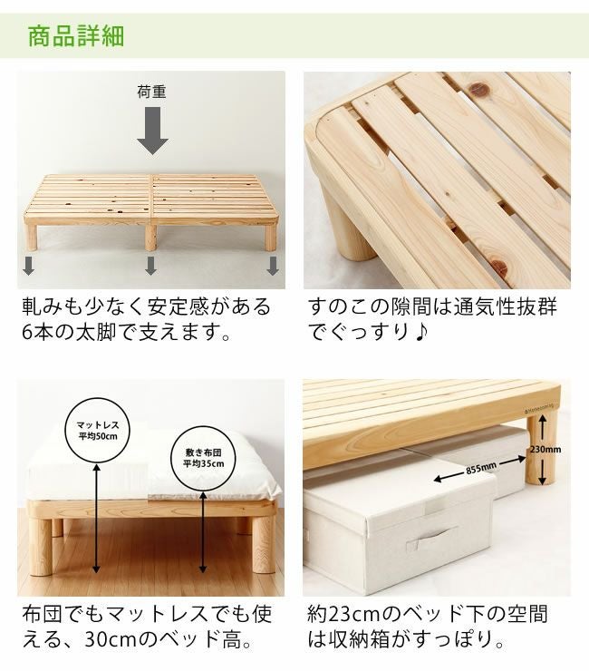 | 広島県の職人が丁寧に作り上げたひのき材のすのこベッド。無駄な装飾のないすっきりとしたシンプルさ、天然木ならではのナチュラルな風合でお部屋を優しい印象にしてくれます。 |