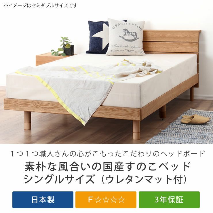 長年続く広島の家具工場の職人さんが、材の調達から加工・製造まで手がけている純国産品すのこベッド。桧の木目や節のナチュラルな風合いは、和室にも洋室にも合わせやすいテイストです。