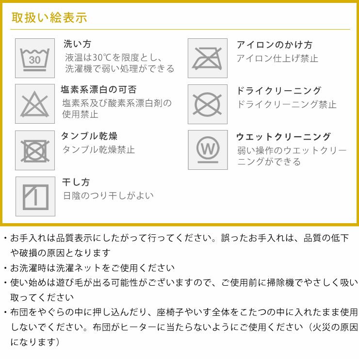 ・お手入れは洗濯表示にしたがって行ってください。誤ったお手入れは、品質低下・破損の原因となります