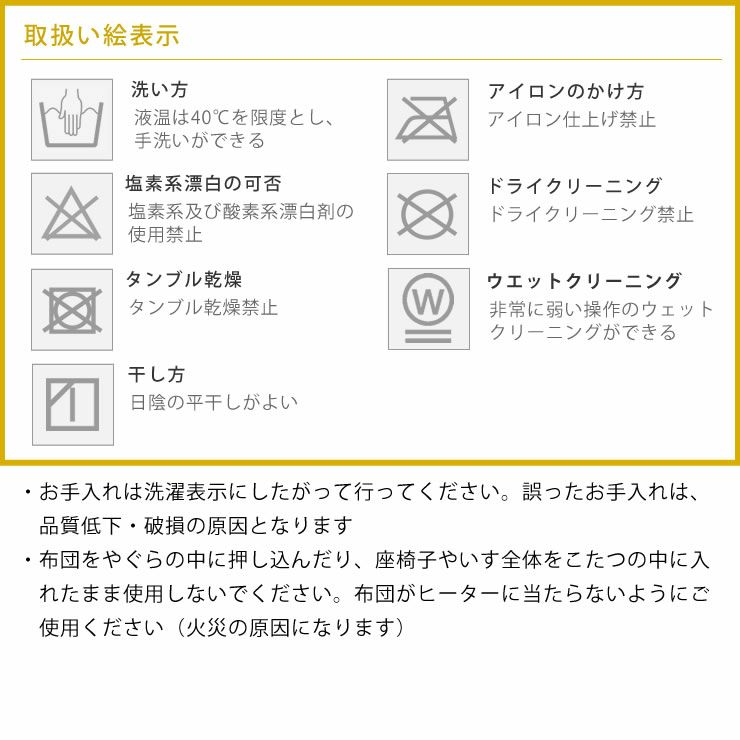 ・お手入れは洗濯表示にしたがって行ってください。誤ったお手入れは、品質低下・破損の原因となります