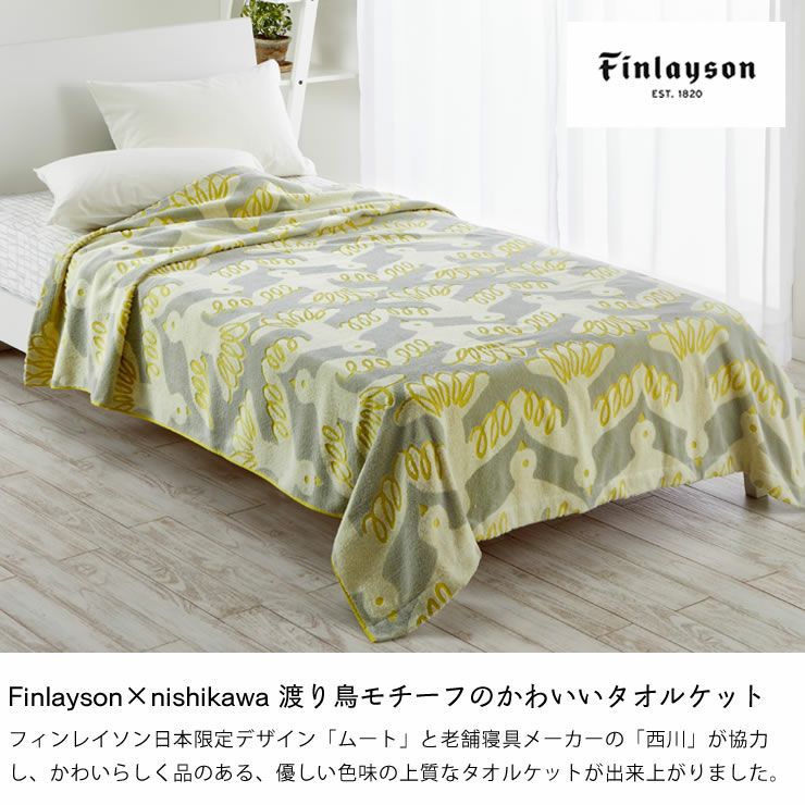 北欧フィンランド最古のテキスタイルブランド「FINLAYSON」の「ムート」柄タオルケット。フィンランド建国100周年を記念して作られた日本限定デザイン「ムート」柄と老舗寝具メーカーの「西川」が協力し、かわいらしく品のある、優しい色味の上質なタオルケットが出来上がりました。ふっくらとしたボリューム感が魅力的で、タオルのふわふわ触感に包まれるように心地良く眠れます。コットンならではの吸水性の良さを活かして、暑い季節は1枚で、寒い季節には羽毛布団の「インナーケット」として、一年中ご使用いただけます。寒い季節は羽毛布団と身体の間にタオルケットを入れると、寝ている間の汗や湿気を吸ってサラサラの寝心地になりますよ。