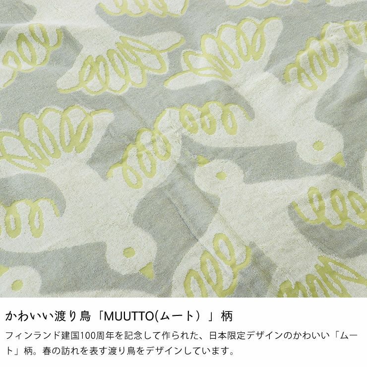 フィンランド建国100周年を記念して作られた、日本限定デザインのかわいい「ムート」柄。春の訪れを表す渡り鳥をデザインしています。ムートは移住という意味。暖かな風とともに、春の生命力をもたらす渡り鳥たちの到来。100年という歴史の中で、去る人、訪れる人が多いフィンランドの国際的なイメージも表現しています。