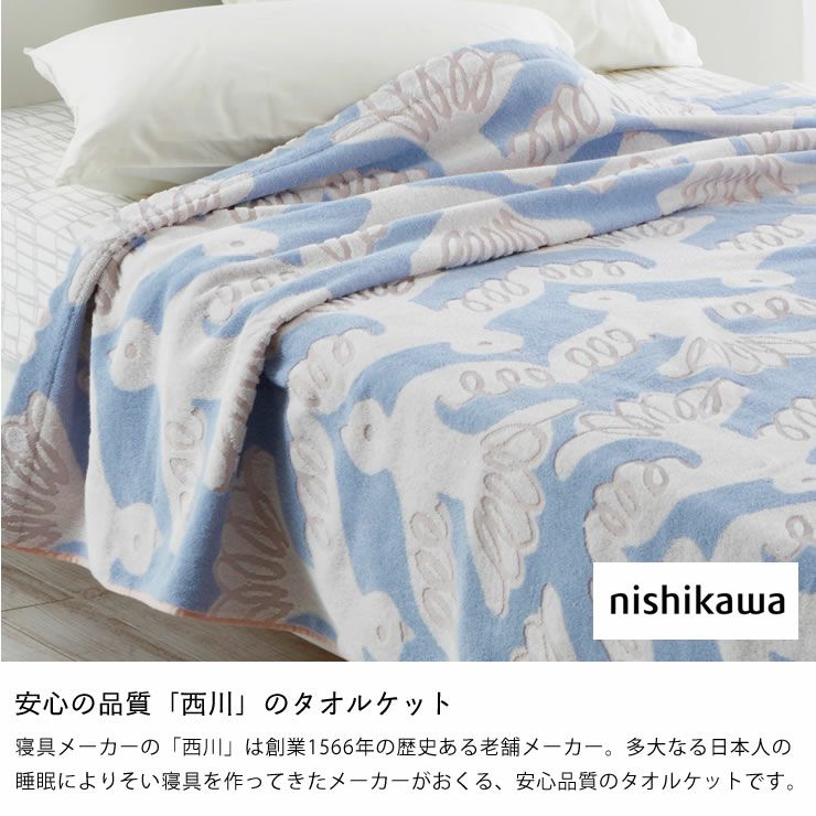 寝具メーカーの「西川」は創業1566年の歴史ある老舗メーカー。多大なる日本人の睡眠によりそい寝具を作ってきたメーカーがおくる、安心品質のタオルケットです。