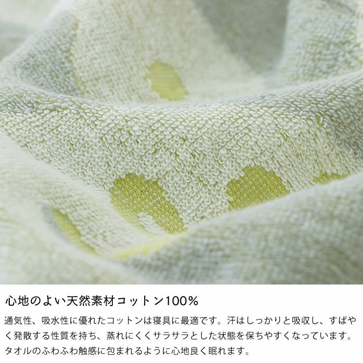 通気性、吸水性に優れたコットンは寝具に最適です。汗はしっかりと吸収し、すばやく発散する性質を持ち、蒸れにくくサラサラとした状態を保ちやすくなっています。タオルのふわふわ触感に包まれるように心地良く眠れます。
