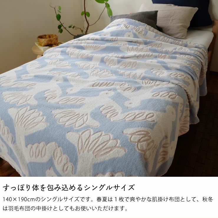 140×190cmのシングルサイズです。春夏は1枚で爽やかな肌掛け布団として、秋冬は羽毛布団の中掛けとしてもお使いいただけます。