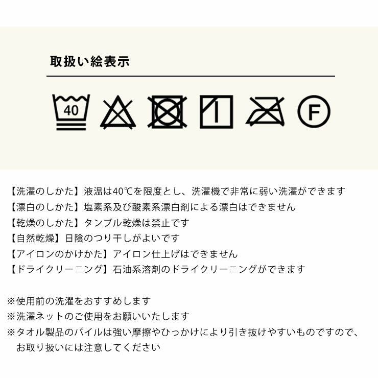 ※タオル製品のパイルは強い摩擦やひっかけにより引き抜けやすいものですので、お取り扱いには注意してください