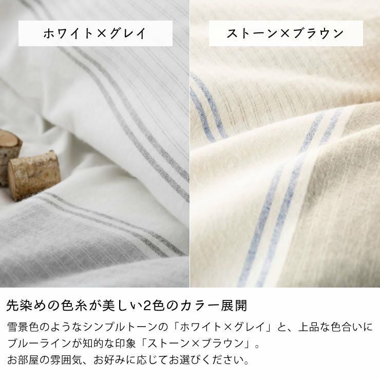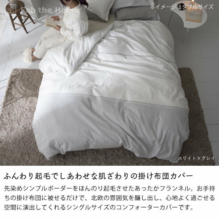 先染めシンプルボーダーをほんのり起毛させたあったかフランネル。お手持ちの掛け布団に被せるだけで、北欧の雰囲気を醸し出し、心地よく過ごせる空間に演出してくれるシングルサイズのコンフォーターカバーです。