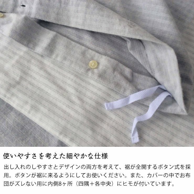 出し入れのしやすさとデザインの両方を考えて、裾が全開するボタン式を採用。ボタンが裾に来るようにしてお使いください。また、カバーの中でお布団がズレない用に内側8ヶ所(四隅+各中央)にヒモが付いています。