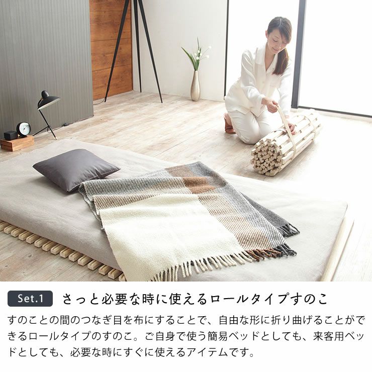 使いたい時にすぐ取り出せて、使わない時には丸めてコンパクトに収納。簡易ベッドやお客様用の寝具としても使えるロールすのこに、ふっくら敷き布団をセットにしたお得な数量限定セットです。