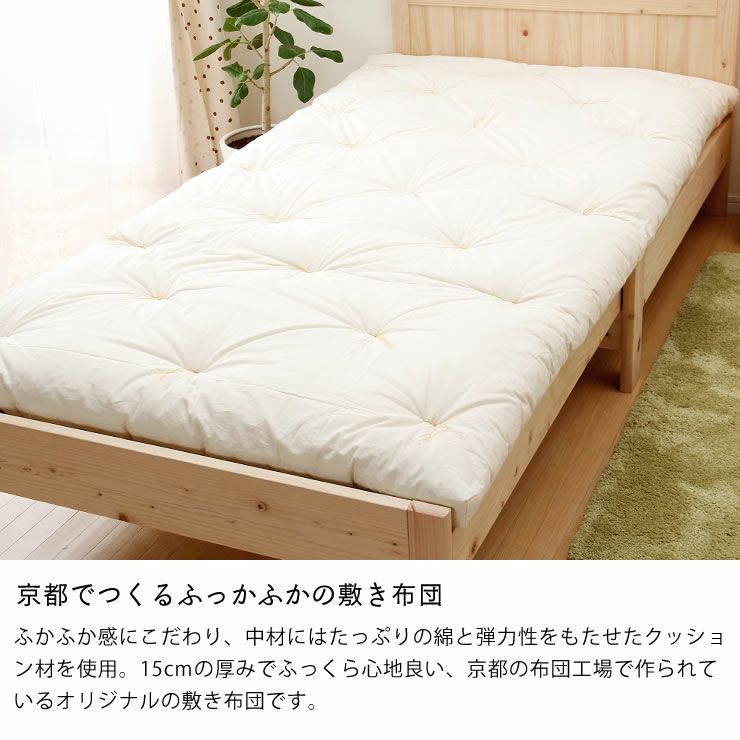 ふかふか感にこだわり、中材にはたっぷりの綿と弾力性をもたせたクッション材を使用。15cmの厚みでふっくら心地良い、京都の布団工場で作られているオリジナルの敷き布団です。