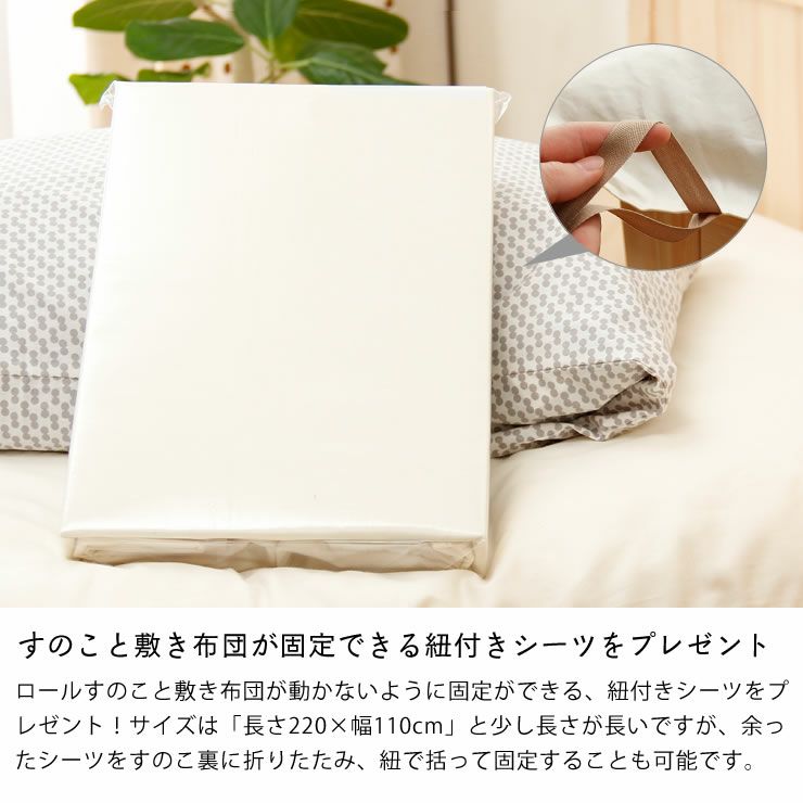 ロールすのこと敷き布団が動かないように固定ができる、紐付きシーツをプレゼント!サイズは「長さ220×幅110cm」と少し長さが長いですが、余ったシーツをすのこ裏に折りたたみ、紐で括って固定することも可能です。