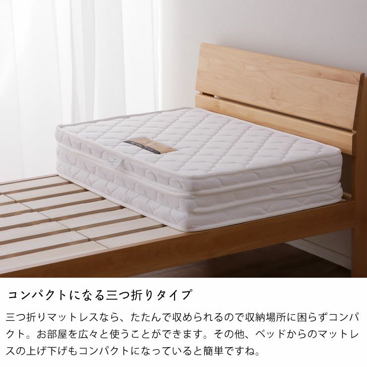 三つ折りマットレスなら、たたんで収められるので収納場所に困らずコンパクト。お部屋を広々と使うことができます。その他、ベッドからのマットレスの上げ下げもコンパクトになっていると簡単ですね。