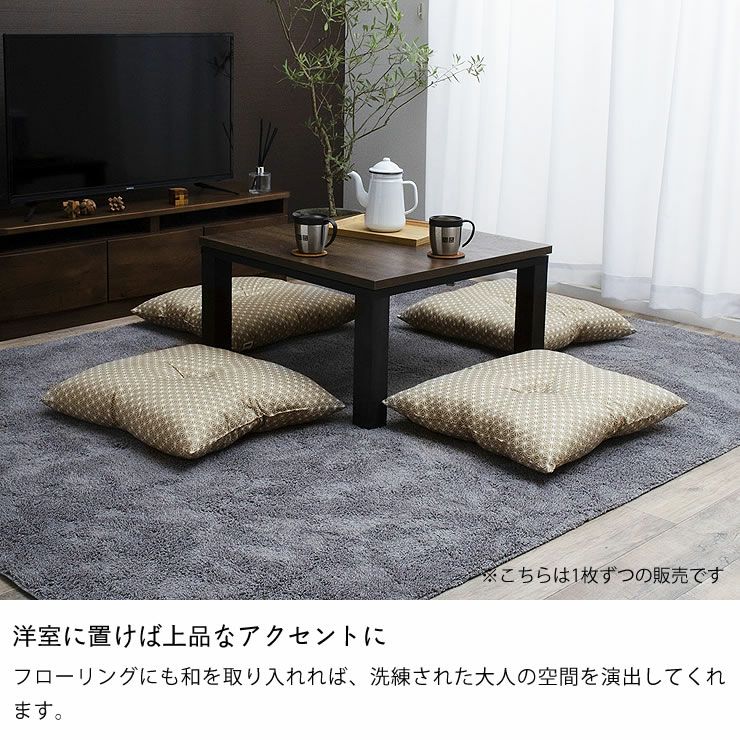 さらりとしたなめらかな肌触りの生地を使用しています。冬にこたつと一緒に、また、夏のリビングの座布団としても、オールシーズン快適にお使いいただけます。