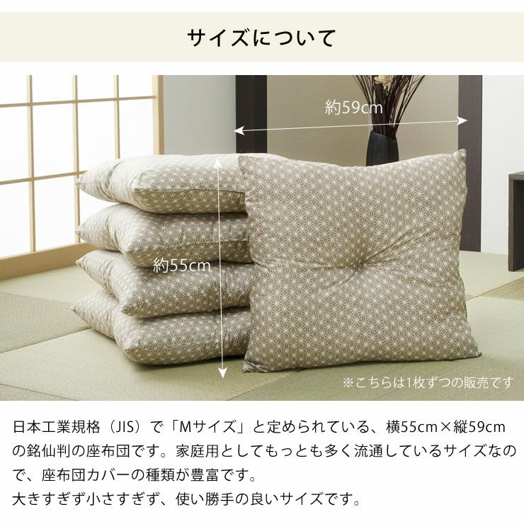 日本工業規格(JIS)で「Mサイズ」と定められている、横55cm×縦59cmの銘仙判の座布団です。家庭用としてもっとも多く流通しているサイズなので、座布団カバーの種類が豊富です。