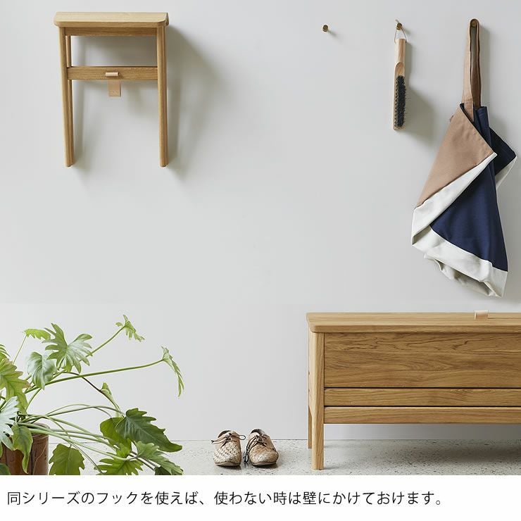 同シリーズのフックを使えば、使わない時は壁にかけておけます。