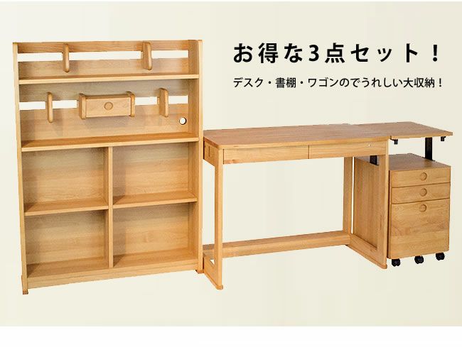 | デスク周りの収納が充実した学習デスクセット。大きな引き出しのデスクと、組み換えできる棚、移動式のワゴンの3点セットです。使いやすいシンプルなデザインで長くお使いいただけます。 |