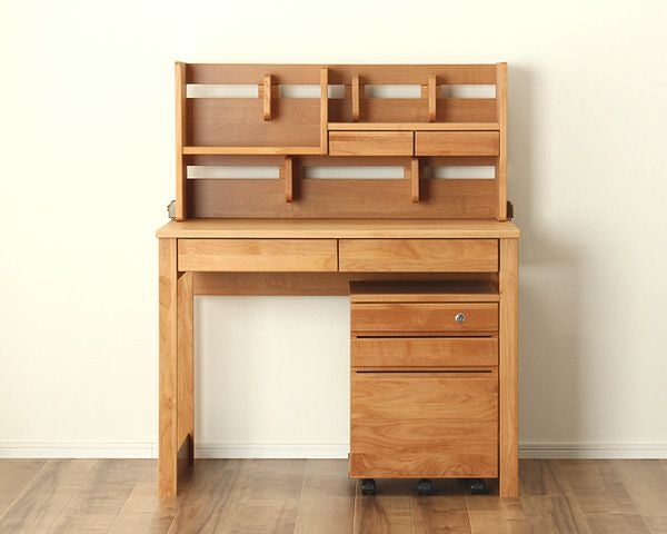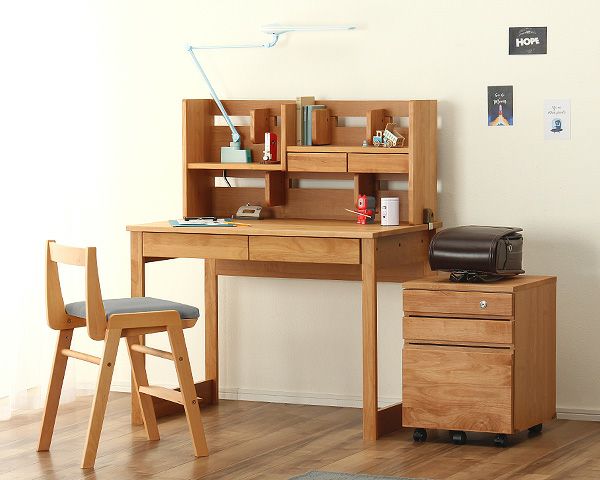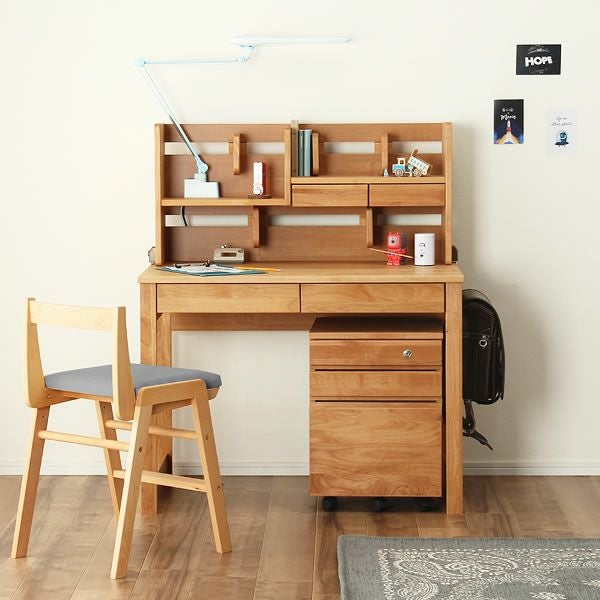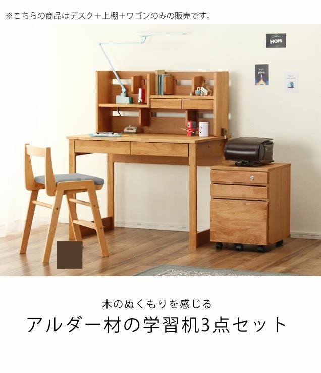 アルダー無垢材使用の学習机、上棚、ワゴンの3点セット。天然木の色合いが優しく、大人になっても使い続けることができるシンプルなデザインです。