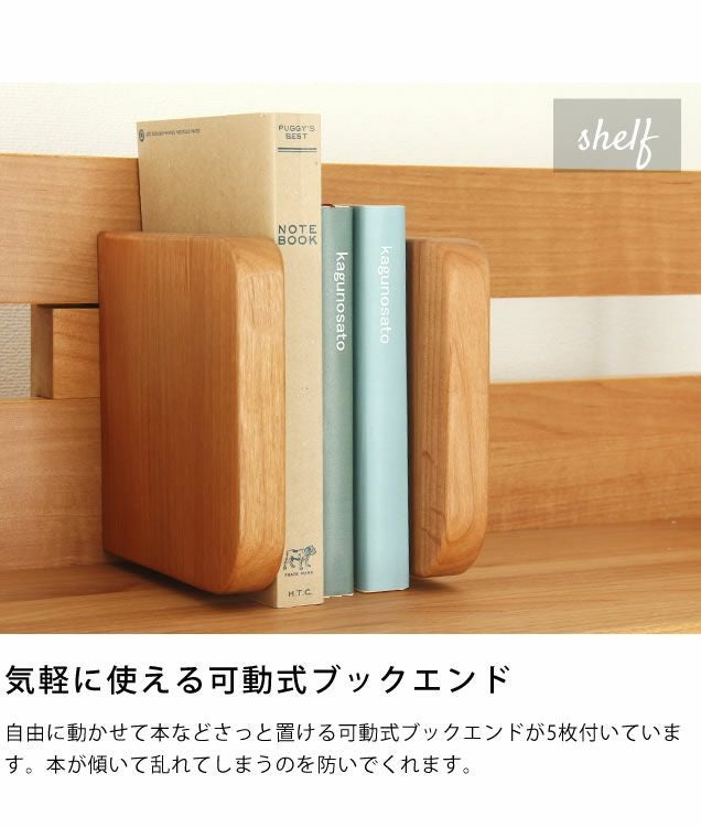 自由に動かせて本などさっと置ける可動式ブックエンドが5枚付いています。本が傾いて乱れてしまうのを防いでくれます。