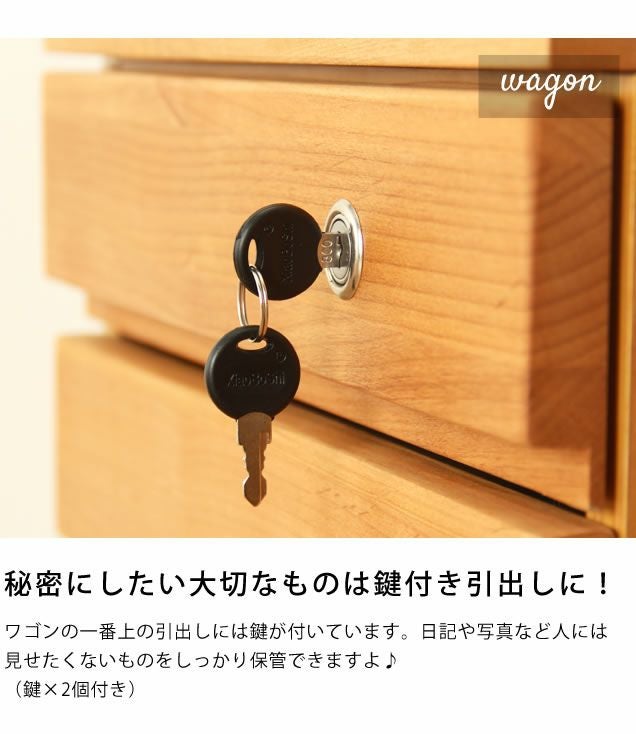 ワゴンの一番上の引出しには鍵が付いています。日記や写真など人には見せたくないものをしっかり保管できますよ♪(鍵×2個付き)
