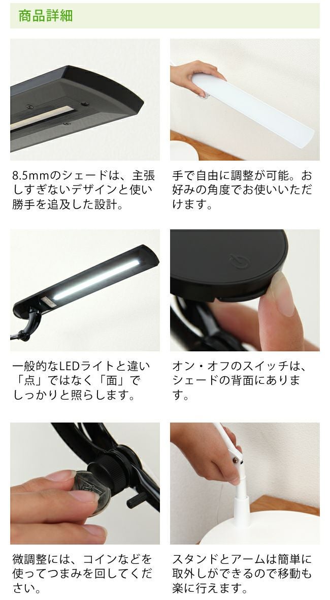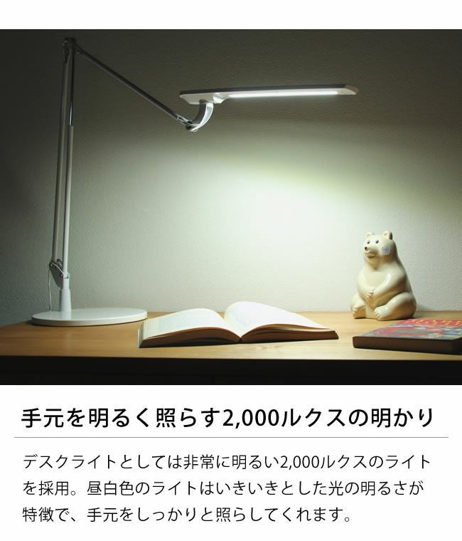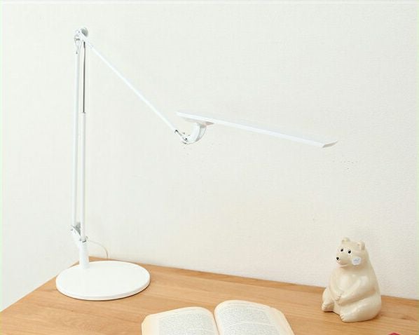 線で描いたようなスタイリッシュさのある美しいLEDデスクライト。チラツキがなく明るいく手元を照らしてくれます。また、光に紫外線と電磁波は含まない人や目に優しいライトです。LEDライトなので、長寿命で消費電力も少ないエコなアイテムです。