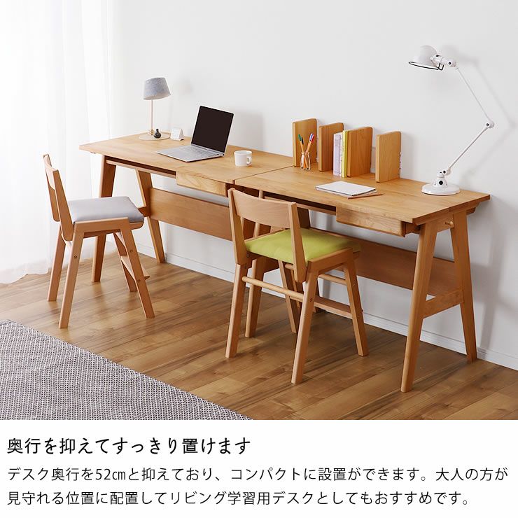 デスク奥行を52cmと抑えており、コンパクトに設置ができます。大人の方が見守れる位置に配置してリビング学習用デスクとしてもおすすめです。