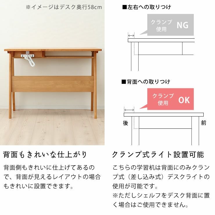 こちらの学習机は背面にのみクランプ式(差し込み式)デスクライトの使用が可能です。※ただしシェルフをデスク背面に置く場合はご使用できません。