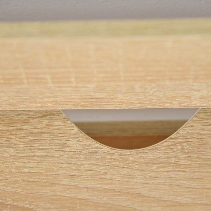 天板は木目が美しくナチュラルな雰囲気。表面は樹脂を浸透させた紙を何層も重ね合わせたメラミン貼りで、光沢感のある仕上がりになっています。表面が硬質でキズや水分・熱に強く、頑丈なのが特徴です。