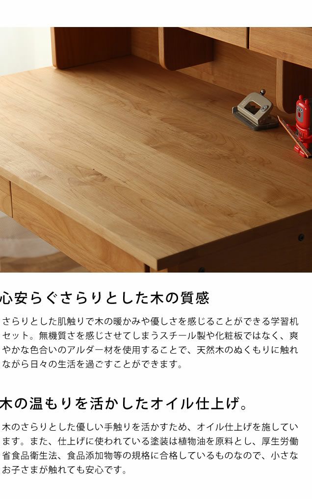 さらりとした肌触りで木の暖かみや優しさを感じることができる学習机セット。無機質さを感じさせてしまうスチール製や化粧板ではなく、爽やかな色合いのアルダー材を使用することで、天然木のぬくもりに触れながら日々の生活を過ごすことができます。