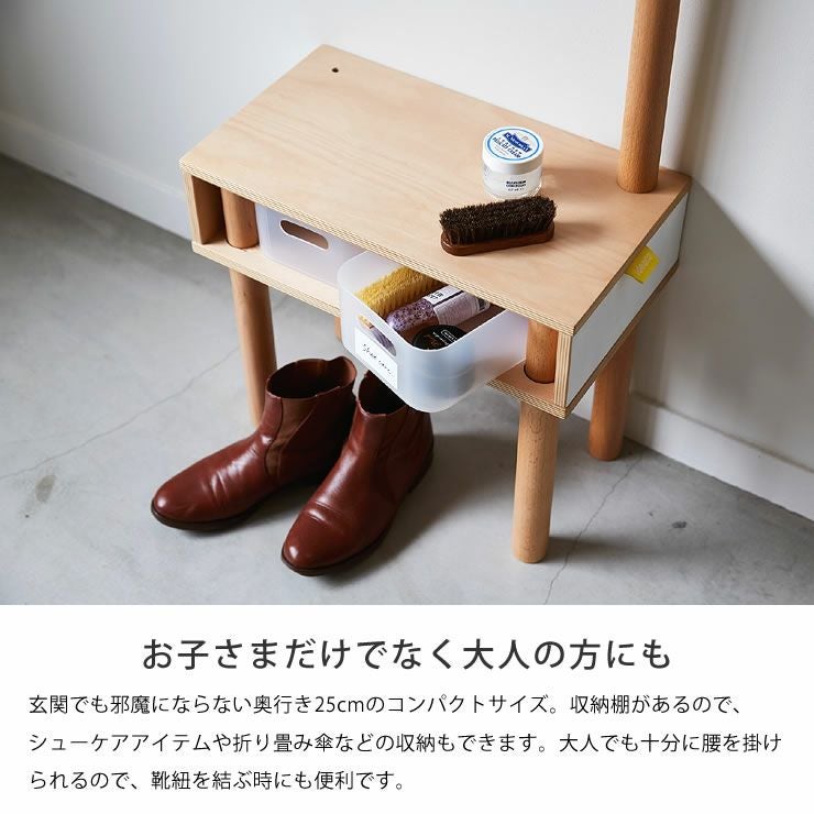 玄関でも邪魔にならない奥行き25cmのコンパクトサイズ。収納棚があるので、シューケアアイテムや折り畳み傘などの収納もできます。大人でも十分に腰を掛けられるので、靴紐を結ぶ時にも便利です。