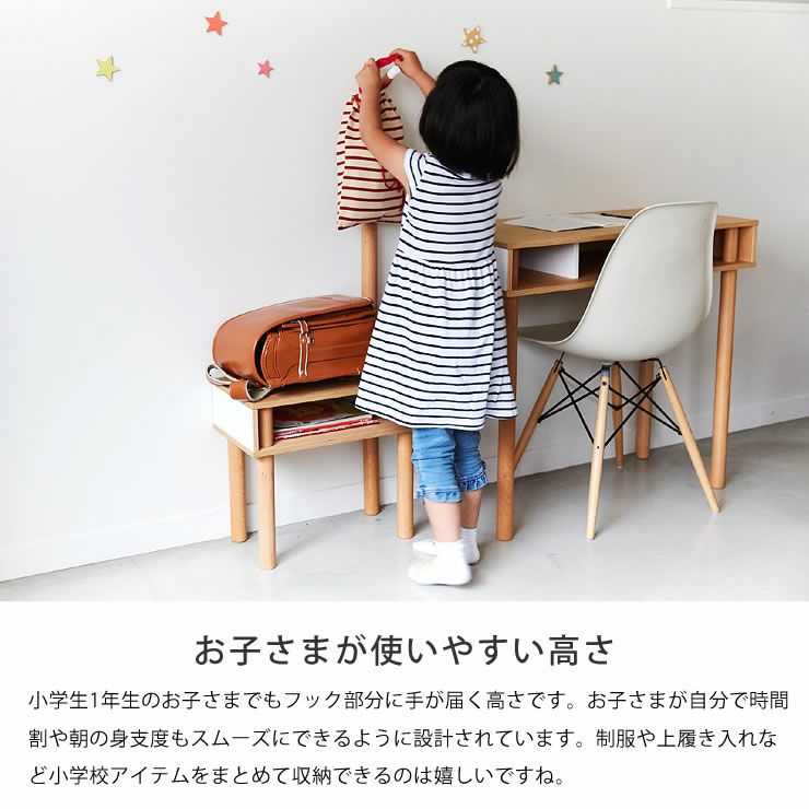 自由にレイアウトできるラック自由にレイアウトを決められるバックパネルが付いた、クッキアシリーズのマルチラック。ランドセルラックとしても使用でき、鍵盤ハーモニカなどの大きいサイズのものも、これ一台でまとめて収納することができます。