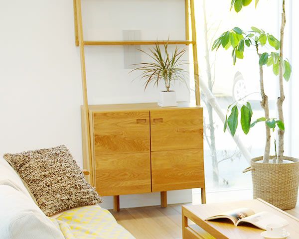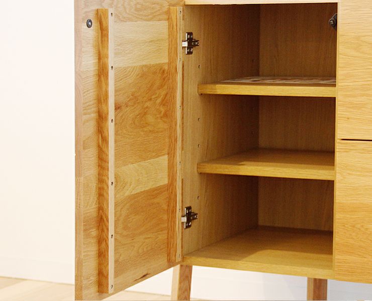 木製のリビングボード・キャビネットは、ナチュラルや北欧、和モダンなど幅広いテイストに調和します。床材やテレビボードなど他の家具と色味を揃えることで、落ち着きのあるリビング空間を演出できます。
