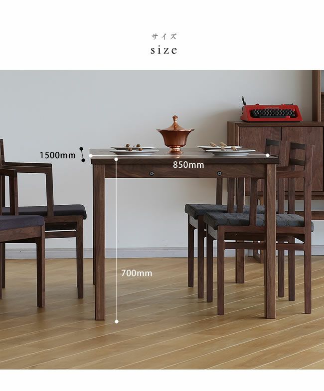 木製ダイニングテーブルウォールナットの風合いを感じる、落ち着いた雰囲気のダイニングテーブル。スリムなデザインの脚は、内側を広くさせ足元に窮屈感をあたえません。