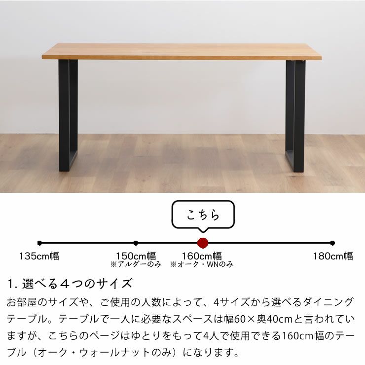 シックな雰囲気でシンプルなデザインのダイニングテーブルランダムな節や木目が楽しめる、表情豊かなアカシア無垢材を使用したダイニングテーブル。