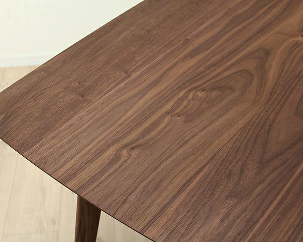 ウォールナットの風合い感じる、落ち着いた雰囲気のダイニングテーブル。テーブルのスリムなデザインの脚は、内側を広くさせ足元に窮屈感を与えません。