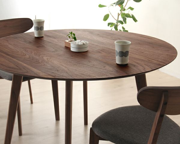 ウォールナットの風合い感じる、優しい雰囲気のダイニングセット。テーブルのスリムなデザインの脚は、内側を広くさせ足元に窮屈感を与えません。