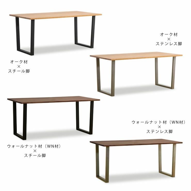 美しい木目を活かした3種類の無垢材の天板と、ブラックのスチール脚またはシルバーのステンレス脚を組み合わせた、4サイズから選べるおしゃれなダイニングテーブル。