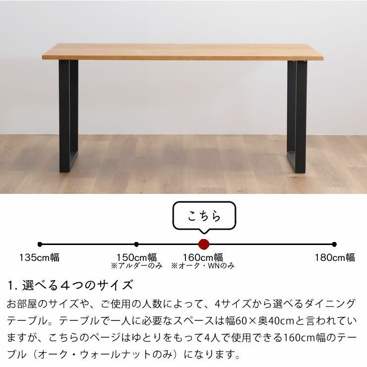 お部屋のサイズや、ご使用の人数によって、4サイズから選べるダイニングテーブル。テーブルで一人に必要なスペースは幅60×奥40cmと言われていますが、こちらのページはゆとりをもって4人で使用できる160cm幅のテーブル(オーク・ウォールナットのみ)になります。
