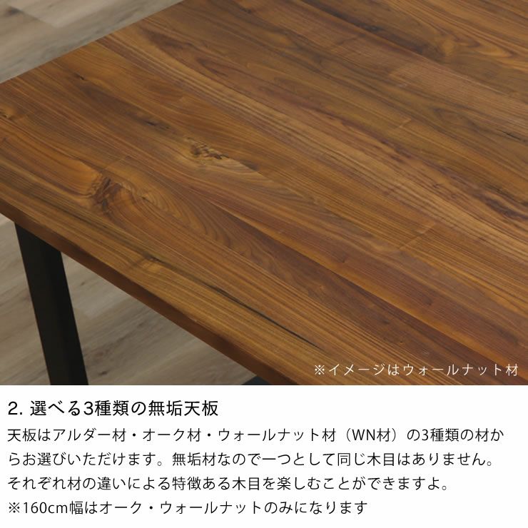 天板は、オーク材・アルダー材・ウォールナット材(WN材)の3種類の無垢材から選べます。高級感のある質感で、一つとして同じ木目はありません。それぞれ材の違いによる特徴ある木目を楽しむことができますよ。