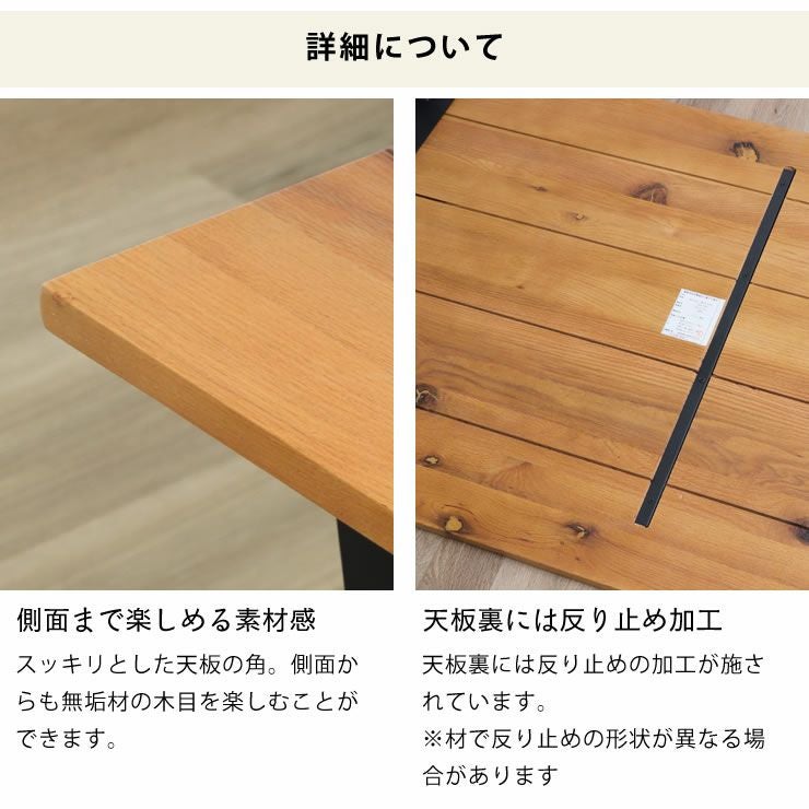 天板の塗装にはウレタン塗装を使用しています。素材感を損なわず、木の風合いを活かしたナチュラルな仕上がり。水に強い特徴があり、飲み物をこぼしてもシミになりにくく、さっと拭くだけで、お手入れも簡単です。